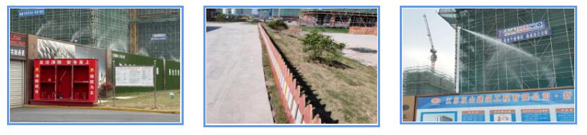 本项目采用高杆喷淋装置,相较于传统的降尘设备,高杆喷淋装置覆盖范围更广,降尘效率更高,有效规避了传统围挡喷淋水压小,移动式雾炮受电源、水源等限制的问题。通过每10分钟进行一次的360度环绕喷淋,搭配围挡上的喷淋装置和现场的移动洒水车,为工地构筑起了3D立体的防尘体系。